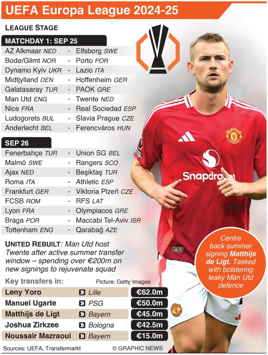25 september 2024 – 26 september 2024 – Belangrijke wedstrijden op speeldag 1 zijn onder meer Manchester United, dat na een actieve zomerse transferperiode meer dan € 200 miljoen uitgaf aan nieuwe spelers om hun selectie te verjongen, het opneemt tegen het Nederlandse team Twente. Terwijl Dynamo Kiev, Ajax en Tottenham Hotspur het respectievelijk opnemen tegen Lazio, Besiktas en Qarabag.