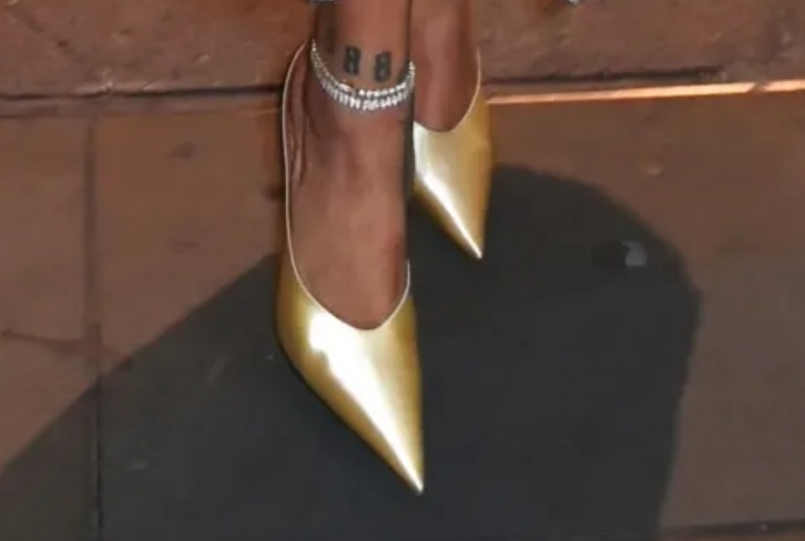 Muaddi beschreef Rihanna’s Anok-muiltje als “custom butter satin.” De glanzende lichtgouden toon complimenteerde haar Jacquemus-jas, die ook een boterachtige tint had.