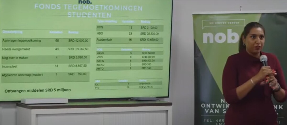 “Het loopt nog niet zo hard”, merkte Abdoelrahman op. Uit de presentatie bleek verder dat er van het totale fonds van 5 miljoen SRD nog geen 50.000 SRD is uitgegeven. Dit betekent dat er nog een aanzienlijk bedrag beschikbaar is voor toekomstige aanvragen voor de tegemoetkomingen op het inschrijfgeld.