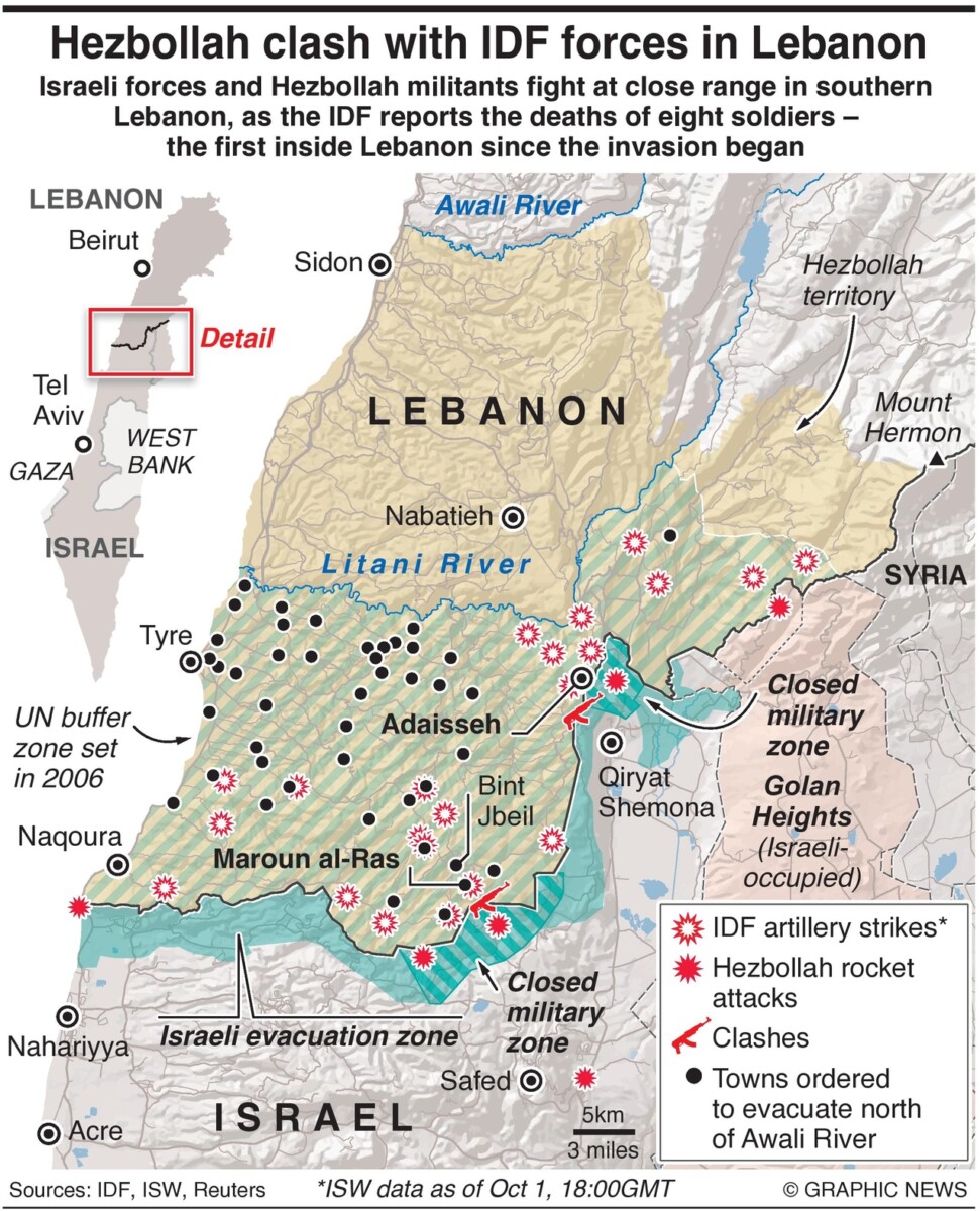 2 oktober 2024 – Israëlische troepen en Hezbollah-militanten vechten van dichtbij in Zuid-Libanon, terwijl de IDF de dood van acht soldaten meldt – de eerste in Libanon sinds het begin van de invasie.