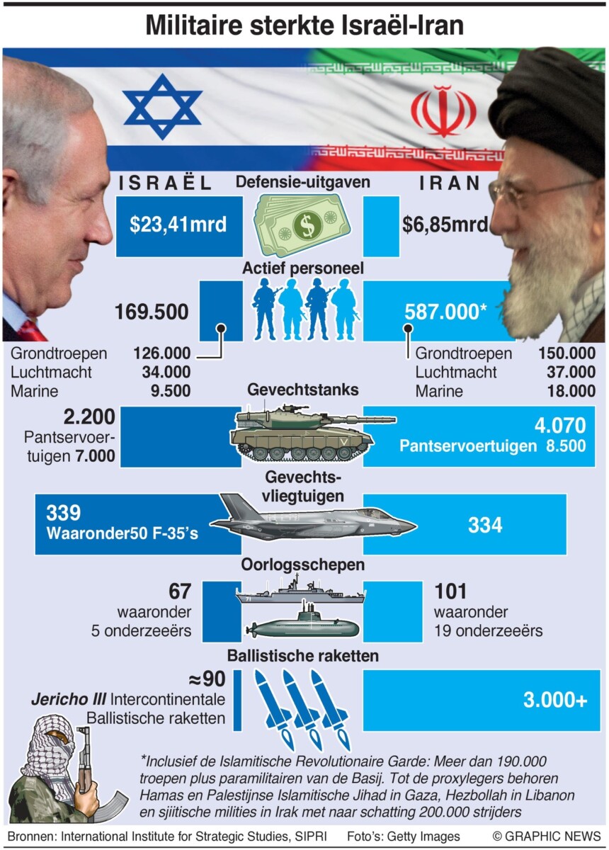Ze tellen 587.000 actieve personeelsleden en 200.000 reservisten. Ondertussen heeft Israël 169.500 actieve personeelsleden en 465.000 reservisten, waarvan ongeveer tweederde sinds de aanvallen van Hamas op 7 oktober in de buurt van de Gazastrook is gestationeerd.