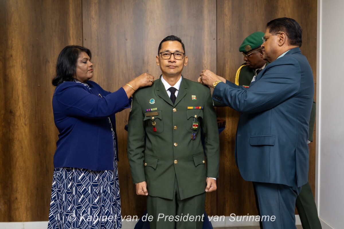 President Chan Santokhi heeft Kolonel Werner Kioe A Sen officieel bevorderd tot Brigade Generaal van het Nationaal Leger, een functie die na tien jaar opnieuw wordt bekleed. Met een loopbaan startend in 1998, heeft Kioe A Sen zich onderscheiden door gespecialiseerde trainingen en diverse rollen. Zijn strategische inzicht is essentieel voor het aanpakken van huidige uitdagingen. De leiding onder zijn bevel belooft onze soevereiniteit, veiligheid en territoriale integriteit effectief te waarborgen.