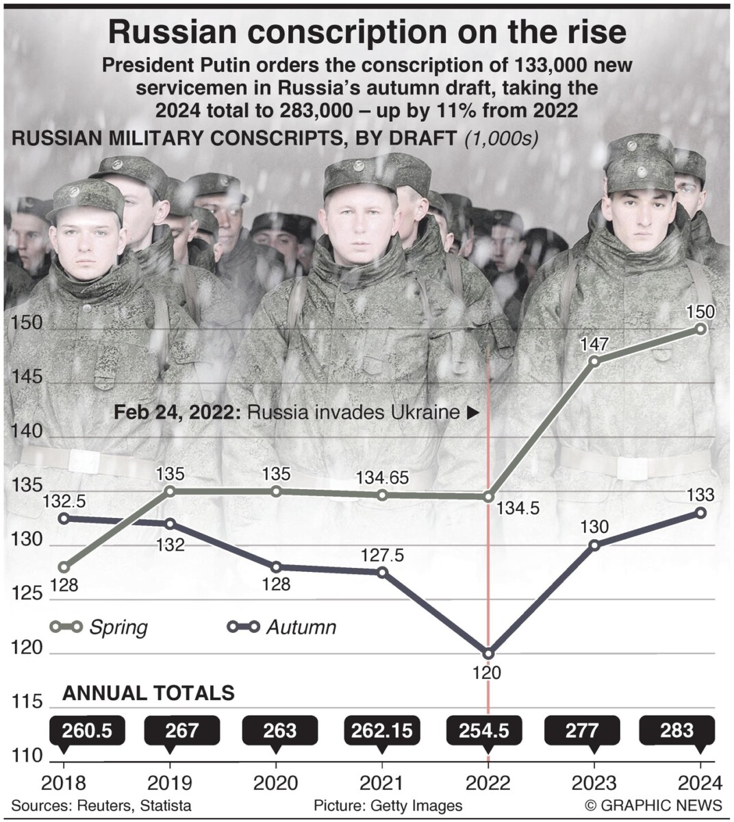 2 oktober 2024 – President Poetin beveelt de dienstplicht van 133.000 nieuwe militairen in de Russische herfstdienst, waarmee het totaal in 2024 op 283.000 komt – 11% meer dan in 2022.