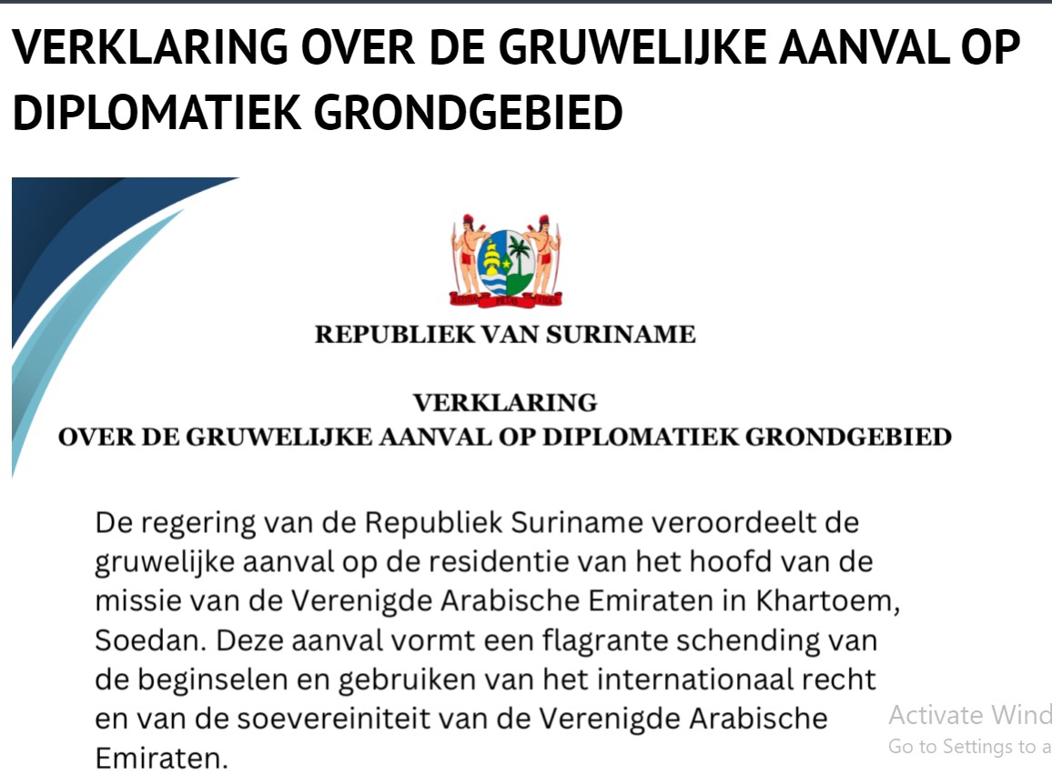 De regering van Suriname veroordeelt krachtig de aanval op de missie van de Verenigde Arabische Emiraten in Khartoem, waarbij internationale rechtsprincipes en soevereiniteit werden benadrukt.