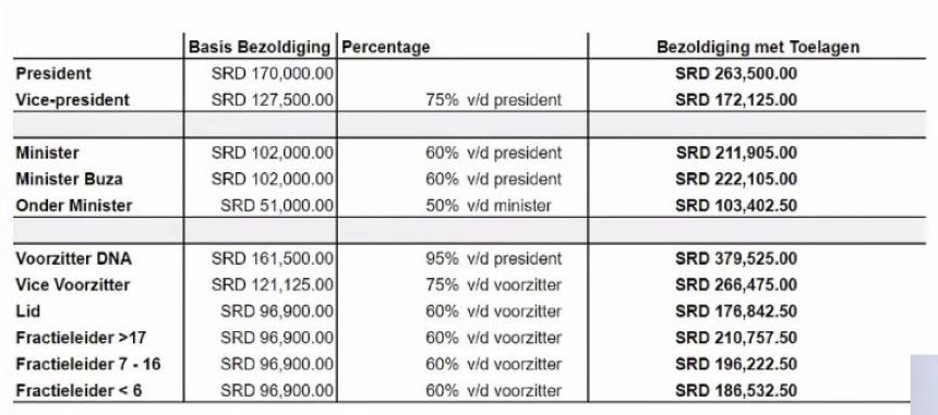 De bezoldiging van de president van het land wordt volgens wetsontwerp vastgesteld op SRD 170.000 per maand. De bezoldiging van de vicepresident bedraagt 75 procent daarvan.
