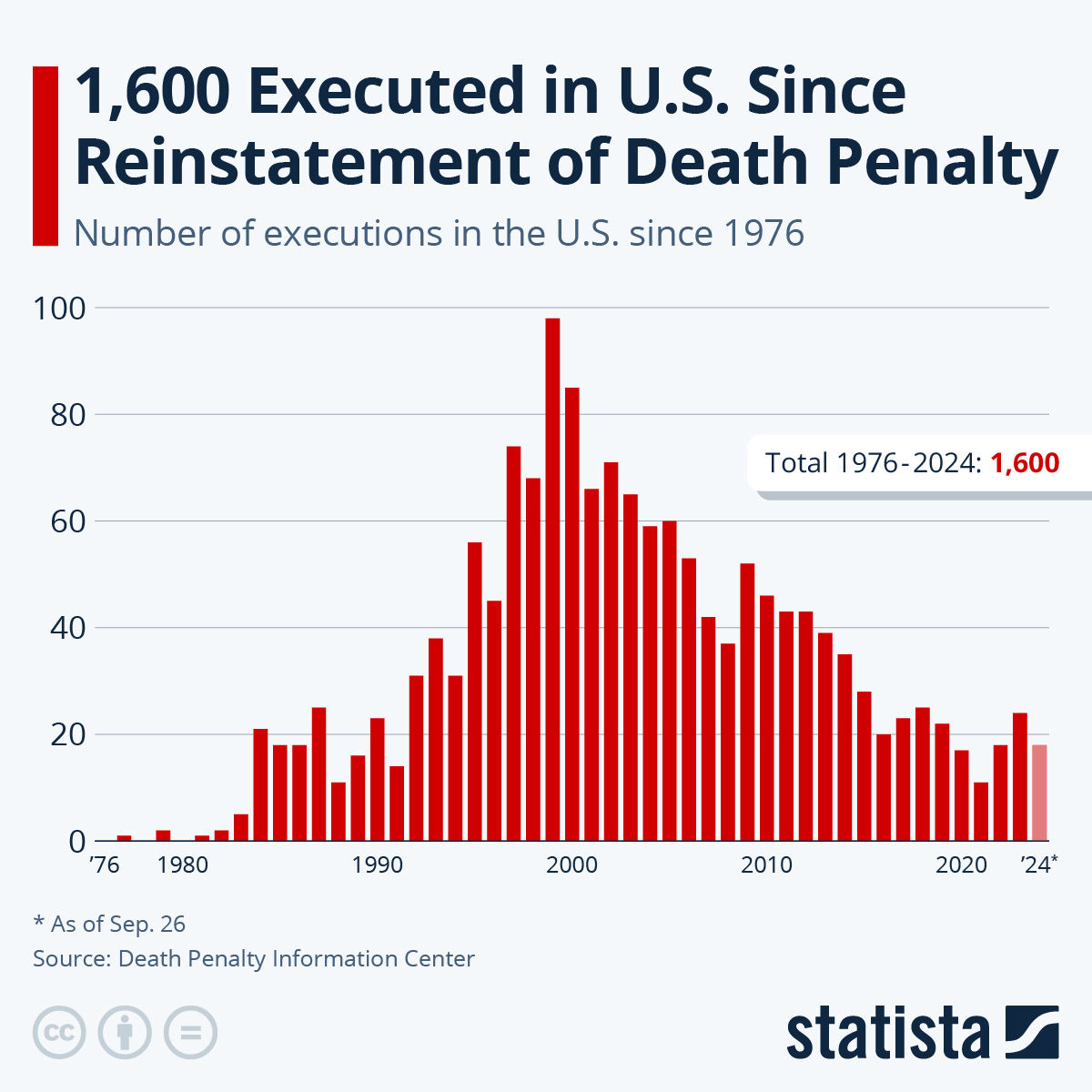 Het aantal executies daalde na de eeuwwisseling, met een dieptepunt in 2021, maar neemt sindsdien toe. Problemen met het verkrijgen van dodelijke injectiemiddelen leiden tot het herintroduceren van alternatieve executiemethoden. Texas blijft koploper met de meeste executies.