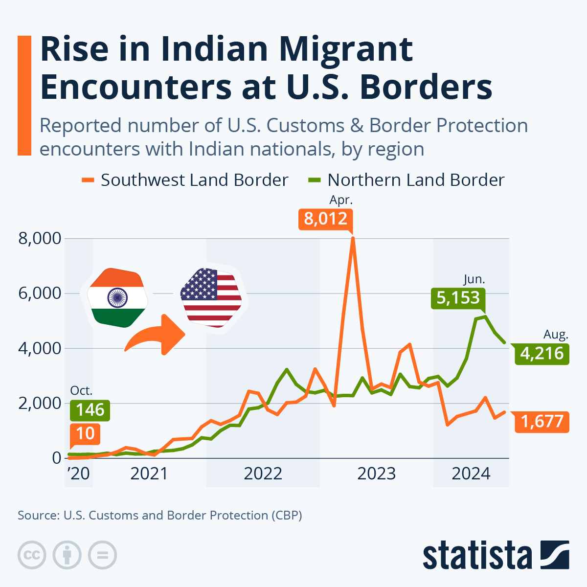 De Amerikaanse douane en grensbescherming rapporteerden meer dan 86.400 Indiase aanhoudingen bij de zuidwestgrens en 88.800 aan de noordgrens tussen oktober 2020 en augustus 2024.