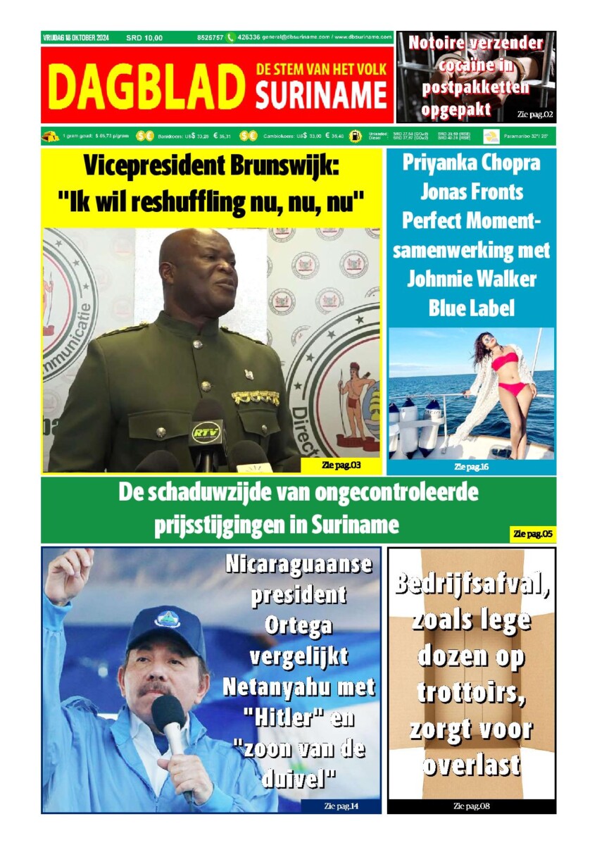 Dagblad Suriname vrijdag 18 oktober 2024 Geplaatst op oktober 18, 2024oktober 17, 2024 Bericht navigatie VorigeLions Club Wanica ondersteunt dak- en thuislozen met donatiesVolgendeVenezuela erkent vurige rituelen ter ere van godin als cultureel erfgoed