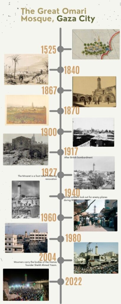 De Grote Moskee van Gaza, die op een van de oudste religieuze plekken van Gaza staat, was eeuwenlang een centrum van het islamitische geloof. Oorspronkelijk gebouwd op de ruïnes van een Byzantijnse kerk na de islamitische verovering in de 7e eeuw, heeft het golven van verwoesting overleefd – van kruisvaardersveroveringen tot restauraties door de Mamluk en het Ottomaanse Rijk.