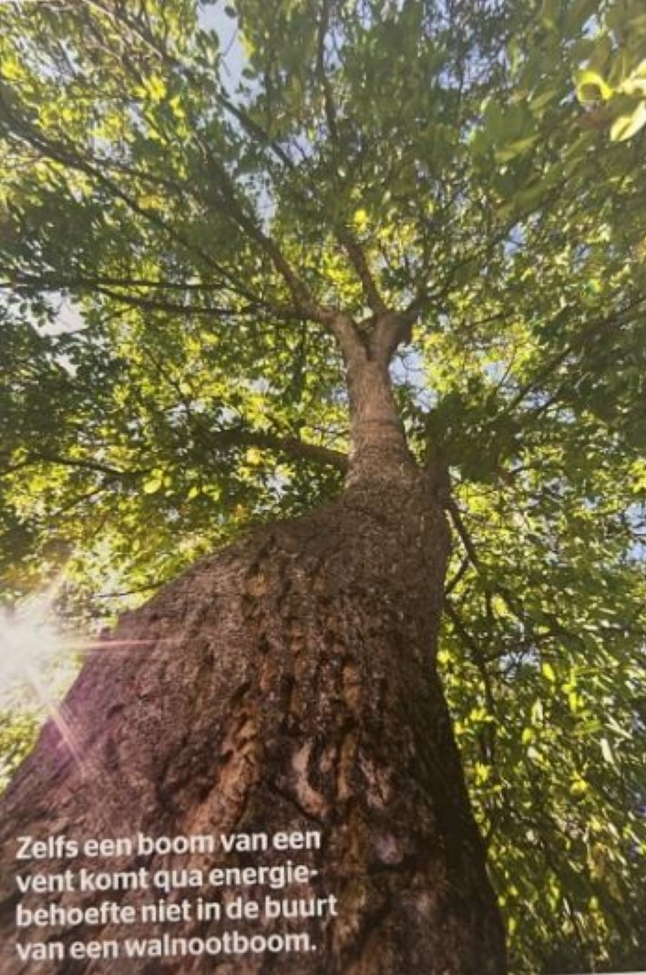 Nieuw-Zeelands onderzoek toont aan dat een oude walnootboom gemiddeld 102 megajoule, ofwel 24.400 kilocalorieën per dag opneemt—bijna tien keer meer dan de dagelijkse behoefte van een gemiddelde man.