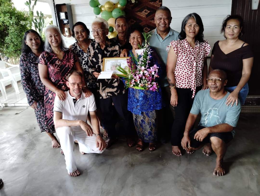 Hij overhandigde namens de regering, de felicitaties middels een bloemstuk, een ingelijste foto van het echtpaar en een gesloten enveloppe met inhoud aan het jubilerend echtpaar, zo bericht het Burger Informatie Centrum Commewijne.