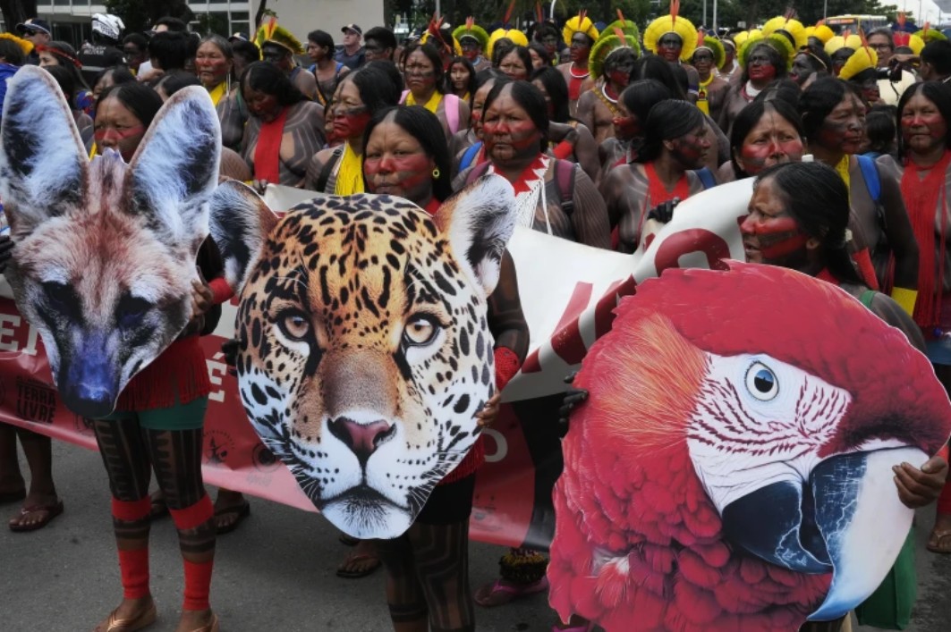 Met afbeeldingen van dieren en bedekt met bodypaint marcheerden honderden inheemse mensen woensdag in de Braziliaanse hoofdstad om het Congres aan te sporen een voorgesteld grondwetswijziging te laten vallen die de potentie heeft om landtoewijzingen te verlammen en zelfs terug te draaien.