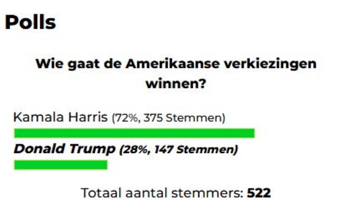 Volgens een recente webpeiling van Dagblad Suriname is Kamala Harris de favoriet om de Amerikaanse verkiezingen te winnen. Harris leidt met 72% van de stemmen (375 stemmen), vergeleken met 28% voor Donald Trump (147 stemmen).