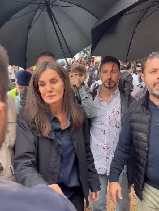 Spaanse premier Sanchez viel aan in Paiporta bij Valencia, waar 200 mensen omkwamen in de overstromingen.