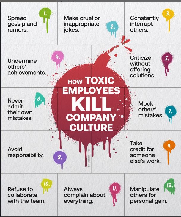 Giftige werknemers hebben een destructieve invloed die subtiel en vaak langdurig is. Een van de grootste schadelijke acties is het verspreiden van roddels en geruchten. Neem bijvoorbeeld John, die na de lunchkamer binnen te lopen, ongefundeerde verhalen over collega’s begint te vertellen, waardoor er wantrouwen en verdeeldheid ontstaat. Het ongemak groeit verder met ongepaste grappen van Sarah, die de werkomgeving onveilig en ongemakkelijk maken.