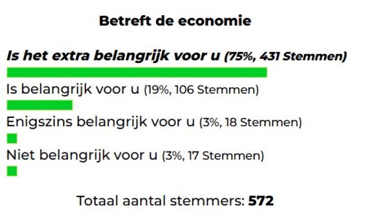 Slechts een kleine groep, 3% voor beide categorieën (18 en 17 stemmen), geeft aan dat de economie enigszins tot niet belangrijk is. Deze resultaten onderstrepen de prioriteit ervan in het huidige maatschappelijk debat.