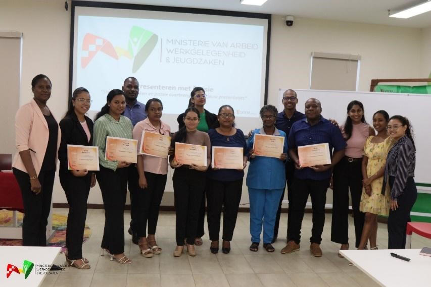 De deelnemers ontvingen 12 november hun certificaten na indrukwekkende presentaties. Naomi Esajas-Friperson, onderdirectrice Arbeidsmarkt van het ministerie van AW&J, benadrukte het belang van presentatievaardigheden voor professionele uitstraling en effectieve communicatie van arbeidsmarktbeleid.
