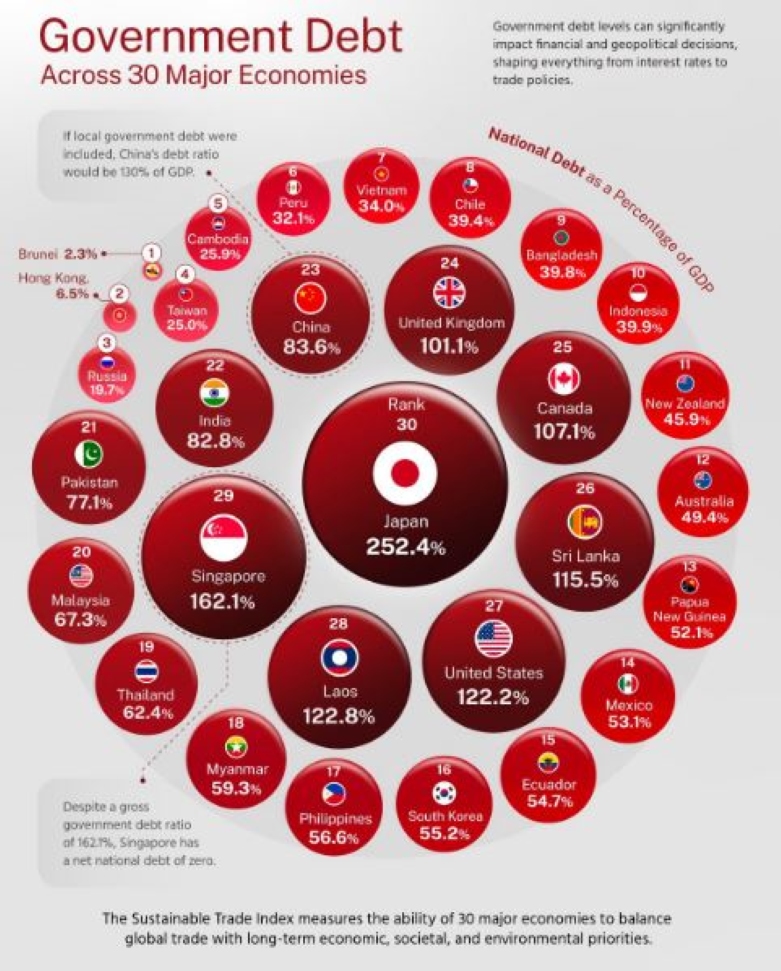 In vergelijking met andere landen is Suriname in het nadeel. Hoewel veel naties met schuldenlasten kampen, kunnen zij dankzij robuuste lokale en exportindustrieën hun verplichtingen nakomen. Dit is bijvoorbeeld in Japan zichtbaar, dat met een schuldratio van 252,4% slechter presteert op de 2024 Sustainable Trade Index. Toch garandeert Japan’s sterke industriële basis enige economische stabiliteit.
