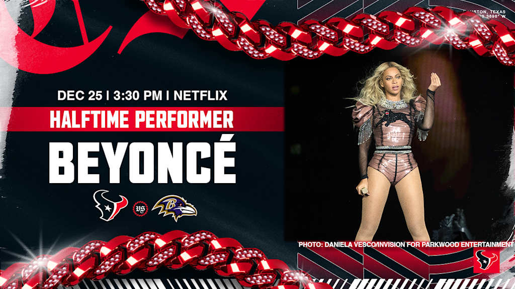 Beyoncé kondigde aan dat ze op 25 december een speciale kerst halftime show zal geven tijdens de wedstrijd van de Houston Texans tegen de Baltimore Ravens. Dit optreden in haar geboortestad Houston markeert haar eerste NFL-optreden in bijna tien jaar.