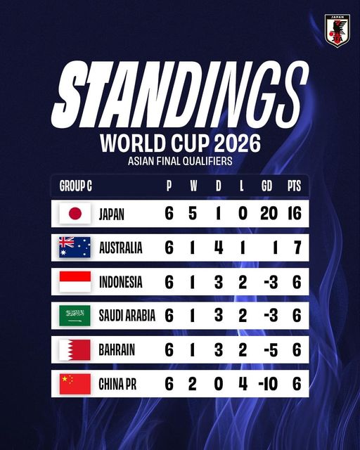 Dit is de stand van #SamuraiBlue in Groep C na speeldag 6 van de kwalificatiewedstrijden voor het WK 2026! Geplaatst op november 20, 2024november 20, 2024 De huidige kwalificatiestand voor het CONMEBOL Wereldkampioenschap 2026 Bericht navigatie VorigeBolivia en Paraguay Gelijk in WK KwalificatiewedstrijdVolgendeNadal Reflecteert op Pensioen na Davis Cup Uitschakeling