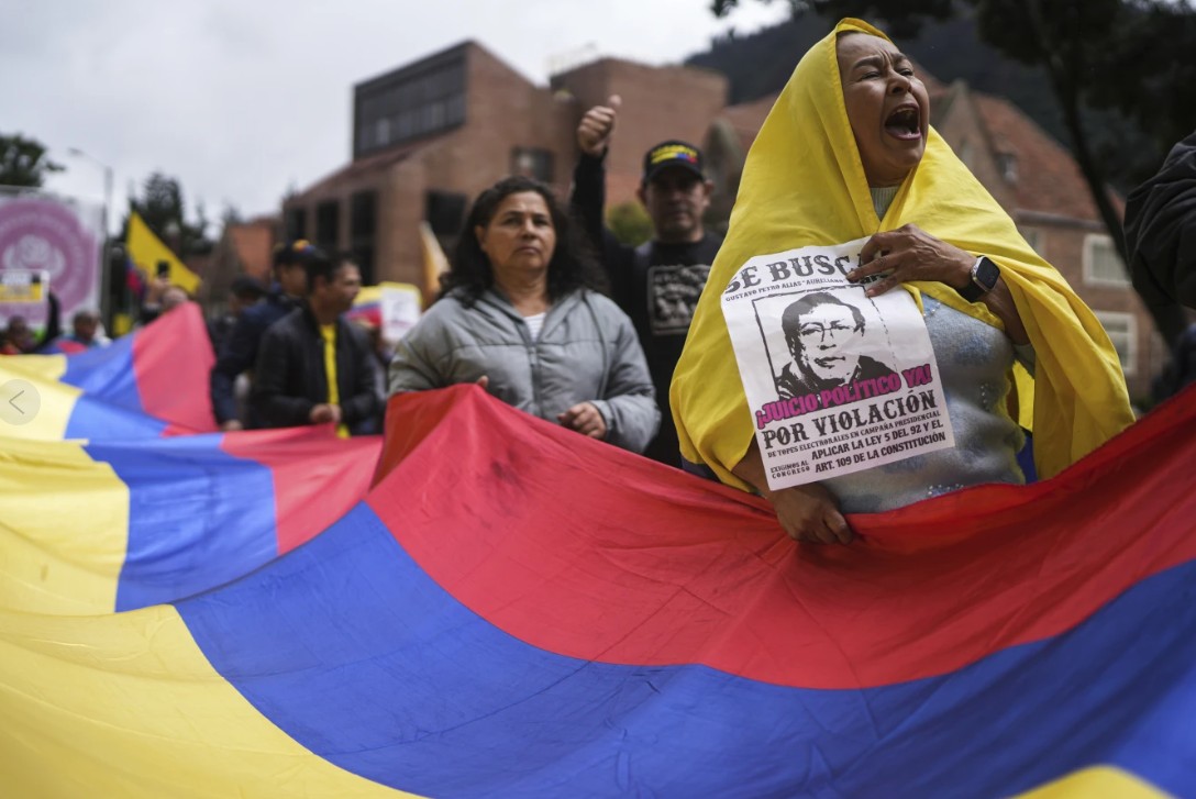 De menigte, waaronder gepensioneerde militairen en oppositieleden, zwaaiden met Colombiaanse vlaggen, waarbij sommige demonstranten borden vasthielden met de tekst “Nee tegen hervormingen van Petro” en “Nee tegen hervormingen van de arbeidsmarkt”.