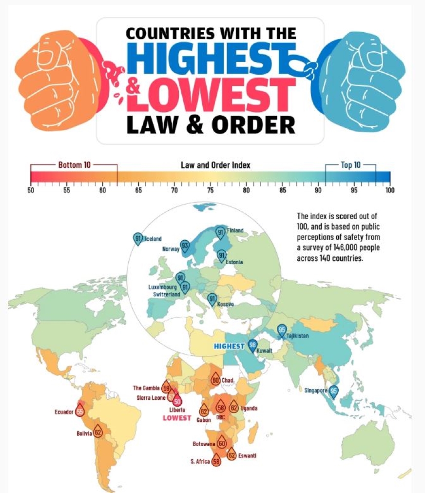 Europa domineert ook de top 10 veiligheidslijst, met landen zoals Finland waar 87% van de bevolking vertrouwen heeft in het politiesysteem. Aan de andere kant ervaart Liberia voor het tweede jaar op rij een lage perceptie van veiligheid, met hoge persoonlijke criminaliteitscijfers en weinig vertrouwen in wetshandhaving.