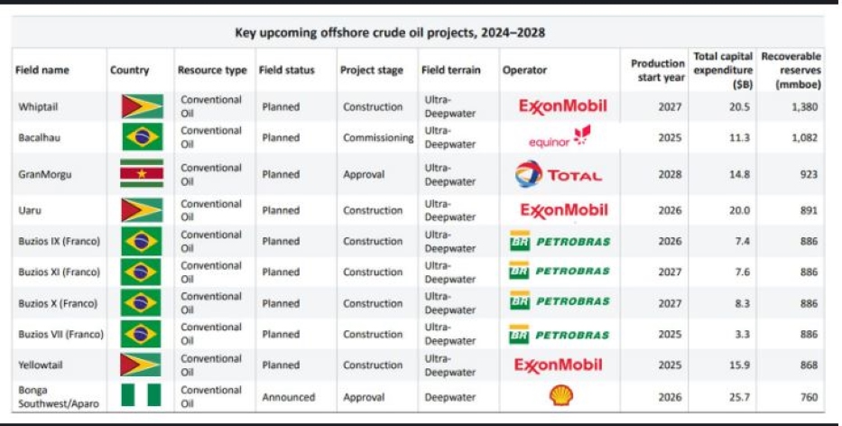 Vooruitzichten van 2024 tot 2028 wijzen op aanzienlijke productie toenames, vooral in ondiepe en ultradiepe wateren. Brazilië, een vooraanstaande producent, intensiveert zijn ruwe olieproductie met diepwater velden zoals Buzios in het pre-salt Santos Basin.