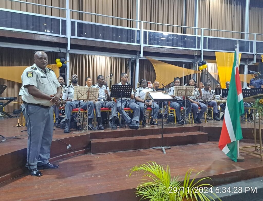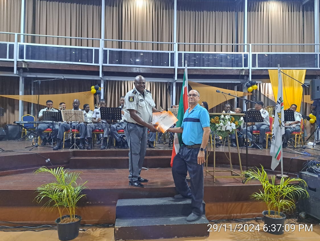 Inspecteur Marlon Fakkers, kapelmeester, nam de boeken dankbaar in ontvangst van OHM-bestuurslid Bhagwan Gangaram Panday. De Politie Kapel, bestaande uit 32 leden, bracht diverse nummers ten gehore ter ere van de gepensioneerden en hun families.
