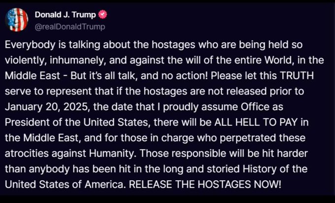 De aankomende Amerikaanse president Donald Trump dreigt dat als Israëlische gevangenen niet vóór zijn inauguratie op 20 januari worden vrijgelaten, “er in het Midden-Oosten een hel losbarst.”