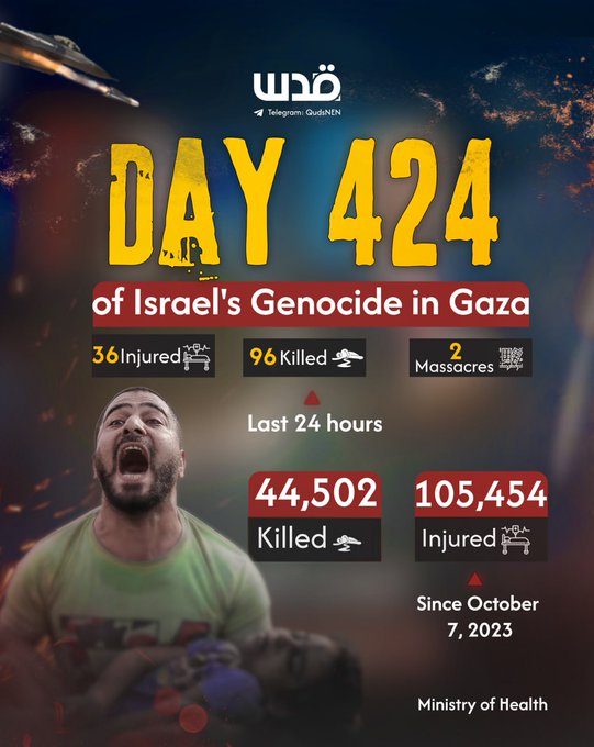 In het voortdurende conflict in Gaza zijn sinds 7 oktober vorig jaar 44.502 Palestijnen gedood, volgens het ministerie van Volksgezondheid van Gaza. De afgelopen 24 uur voerden Israëlische troepen twee verwoestende aanvallen uit, waarbij 36 doden en 96 gewonden vielen. De medische zorg staat op instorten, met ernstige tekorten aan voedsel en water. De infrastructuur is zwaar beschadigd, en veel gezinnen zijn dakloos. De internationale gemeenschap wordt geconfronteerd met een moreel dilemma in het aanpakken van deze crisis. Na 424 dagen blijft Gaza een grimmige herinnering aan de noodzaak voor diplomatieke en humanitaire oplossingen die menselijk leven waarderen.