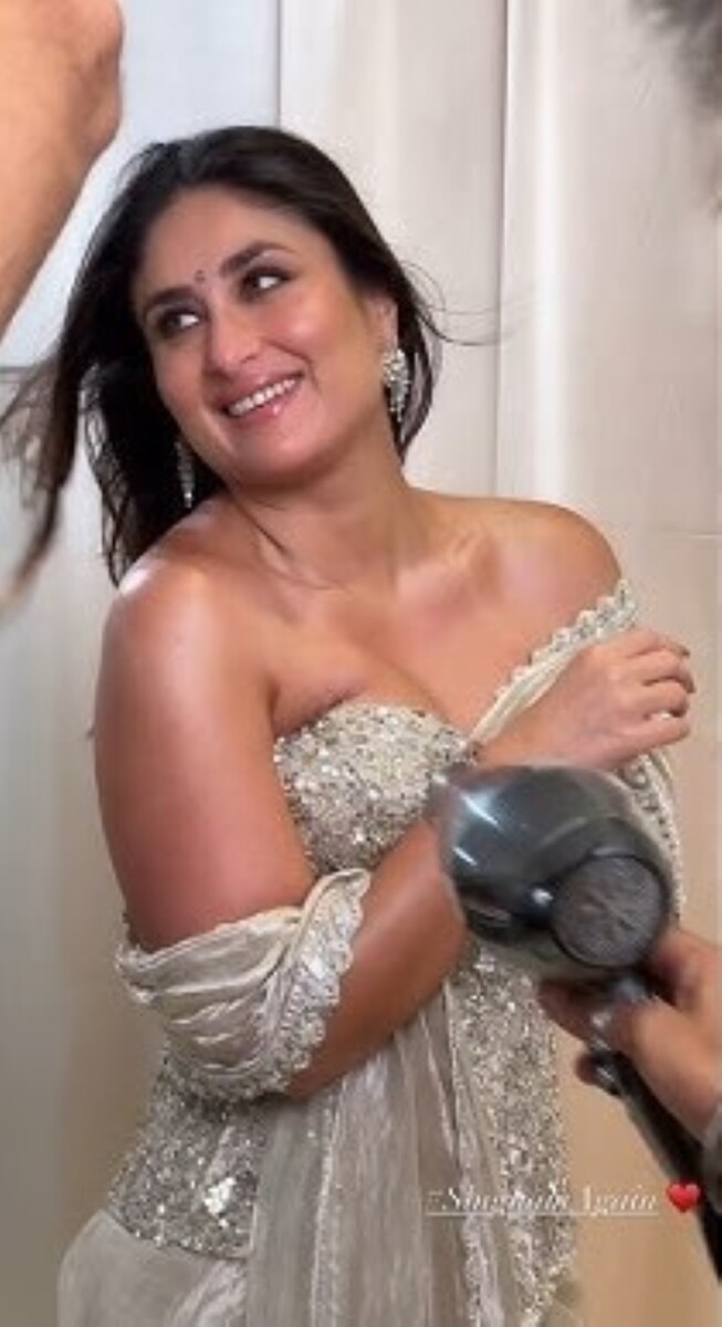 De zes meter lange sari, vol glans en elegantie, benadrukte Kareena’s PHAT-look op de rode loper. Met subtiele accessoires, waaronder diamanten oorbellen en een opvallende ring, en een verfijnde make-upstijl met nude tinten, maakte Kareena haar betoverende verschijning compleet.