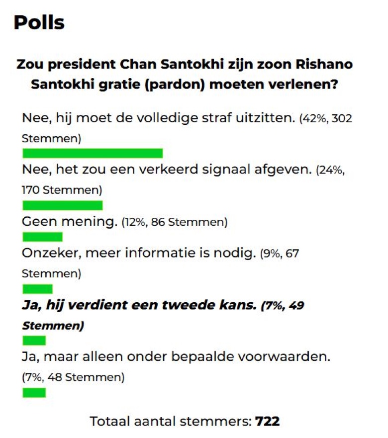 Dagblad Suriname voerde recent een webpoll uit met de vraag of president Chan Santokhi zijn zoon Rishano Santokhi gratie zou moeten verlenen. De resultaten laten zien dat de meningen sterk verdeeld zijn.