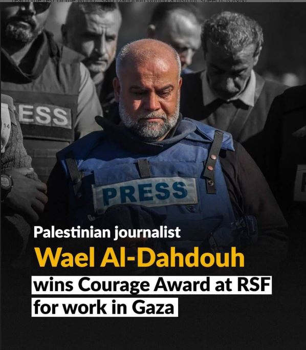 Palestijnse journalist Wael Dahdouh uit Gaza won de Courage Prize tijdens de 32e Press Freedom Awards van Reporters Without Borders (RSF). Dahdouh werd geëerd voor zijn onvermoeibare verslaggeving ondanks persoonlijke tegenslagen, waaronder verwondingen en de dood van familieleden. In zijn toespraak benadrukte hij de offers die gebracht zijn om de wereld op de hoogte te houden van de situatie in Gaza. Dahdouh sprak over de uitputting, verlies en terreur die gepaard gingen met het verzekeren dat nieuws uit het conflictgebied de rest van de wereld bereikte.