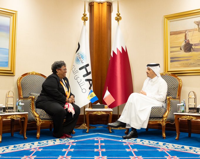 Premier Mia Amor Mottley van Barbados arriveerde vrijdagavond in Doha om deel te nemen aan het prestigieuze Doha Forum 2024 in Qatar.