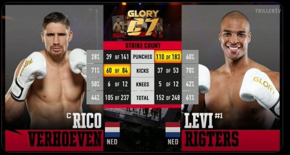 Kickbokser Rico Verhoeven heeft in een zware partij zijn titel verdedigd. In de derde ronde ging de titelverdediger neer, maar hij herpakte zich en sloeg Rigters in de vierde ronde naar de grond. In de vijfde ronde had Rigters een KO nodig om te winnen, maar de ervaren King of Kickboxing liet dat niet gebeuren. Verhoeven won op beslissing in zijn twaalfde titelverdediging.