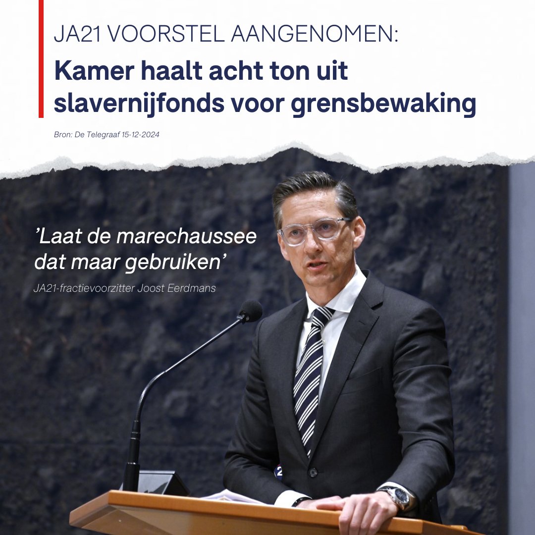 Op voorspraak van JA21-leider Joost Eerdmans wordt 800.000 euro uit het Slavernijfonds overgeheveld naar de Koninklijke Marechaussee voor grenscontroles in Nederland en de Nederlandse Antillen. Meer geld naar grenscontroles in Nederland en op de Antillen, een beetje minder in het slavernijfonds: dat heeft de Tweede Kamer besloten na een voorstel van JA21.