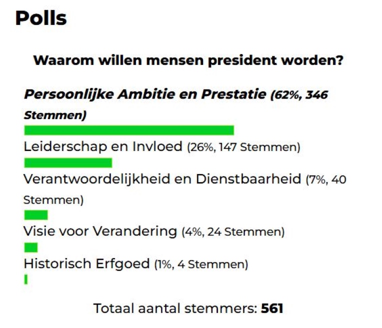 Uit de resultaten blijkt dat persoonlijke ambitie en prestatie de meest genoemde drijfveren zijn, met 62% van de stemmen (346 stemmen). Deze uitkomst suggereert dat de meeste respondenten geloven dat het presidentschap een persoonlijk streven is, een prestatie die aanzienlijke erkenning en status biedt.