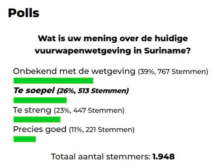 Een onlangs op de website van Dagblad Suriname geplaatste poll heeft inzicht gegeven in de publieke opinie over de huidige vuurwapenwetgeving in Suriname.