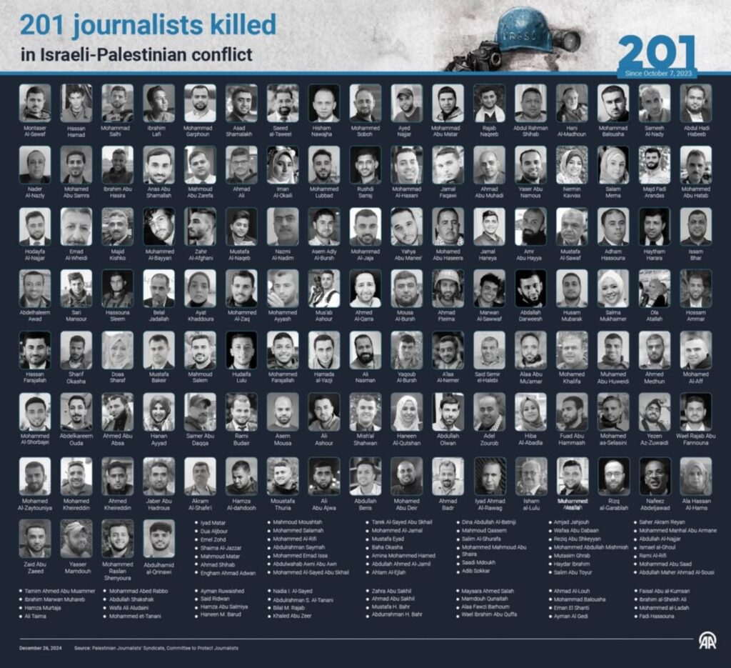 In 2024 doodde Israël 201 journalisten bij zijn aanvallen op Gaza.