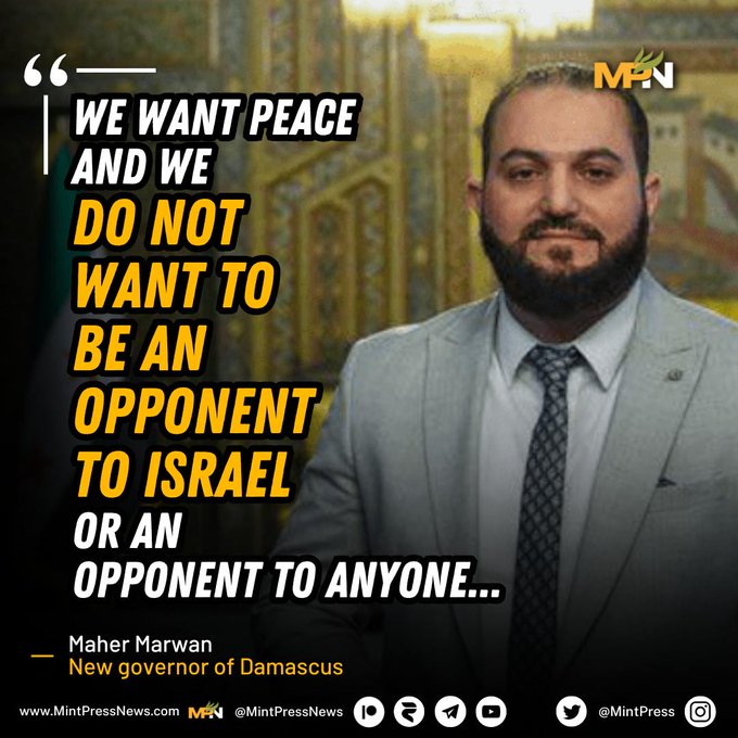 Voor het eerst in de geschiedenis van Syrië bespreken regeringsfunctionarissen openlijk normalisering met Israël en verraad aan de Palestijnse zaak. Dit is wat Maher Marwan, de nieuwe gouverneur van Damascus, voorstelde in een recent interview met het door de Amerikaanse overheid gerunde nieuwsplatform NPR.