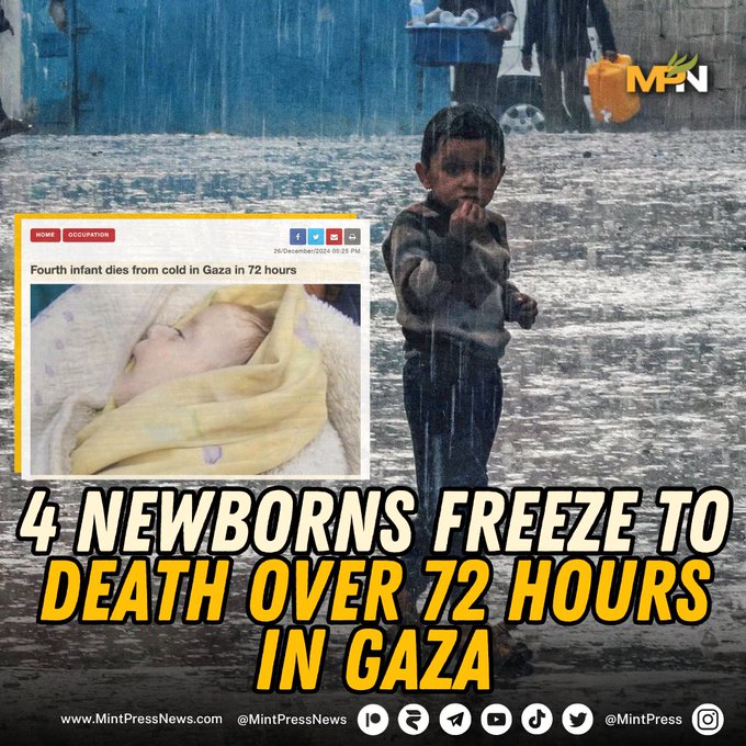 Nu de temperaturen in de Gazastrook dalen en veel ontheemde burgers het onmogelijk vinden om te voorkomen dat de regen hun tenten binnendringt en ze overstroomt, vriezen baby’s nu dood. Dit is een direct gevolg van Israëls blokkade van humanitaire hulp en ontheemding van het grootste deel van de burgerbevolking van Gaza.