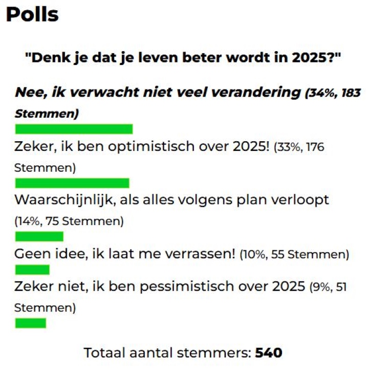 De resultaten tonen een verdeeldheid in de verwachtingen van de bevolking. Uit de poll blijkt dat 33% van de stemmers optimistisch is en gelooft dat 2025 hen positiviteit zal brengen. Deze groep is hoopvol over persoonlijke verbeteringen en mogelijk gunstige ontwikkelingen in het land.