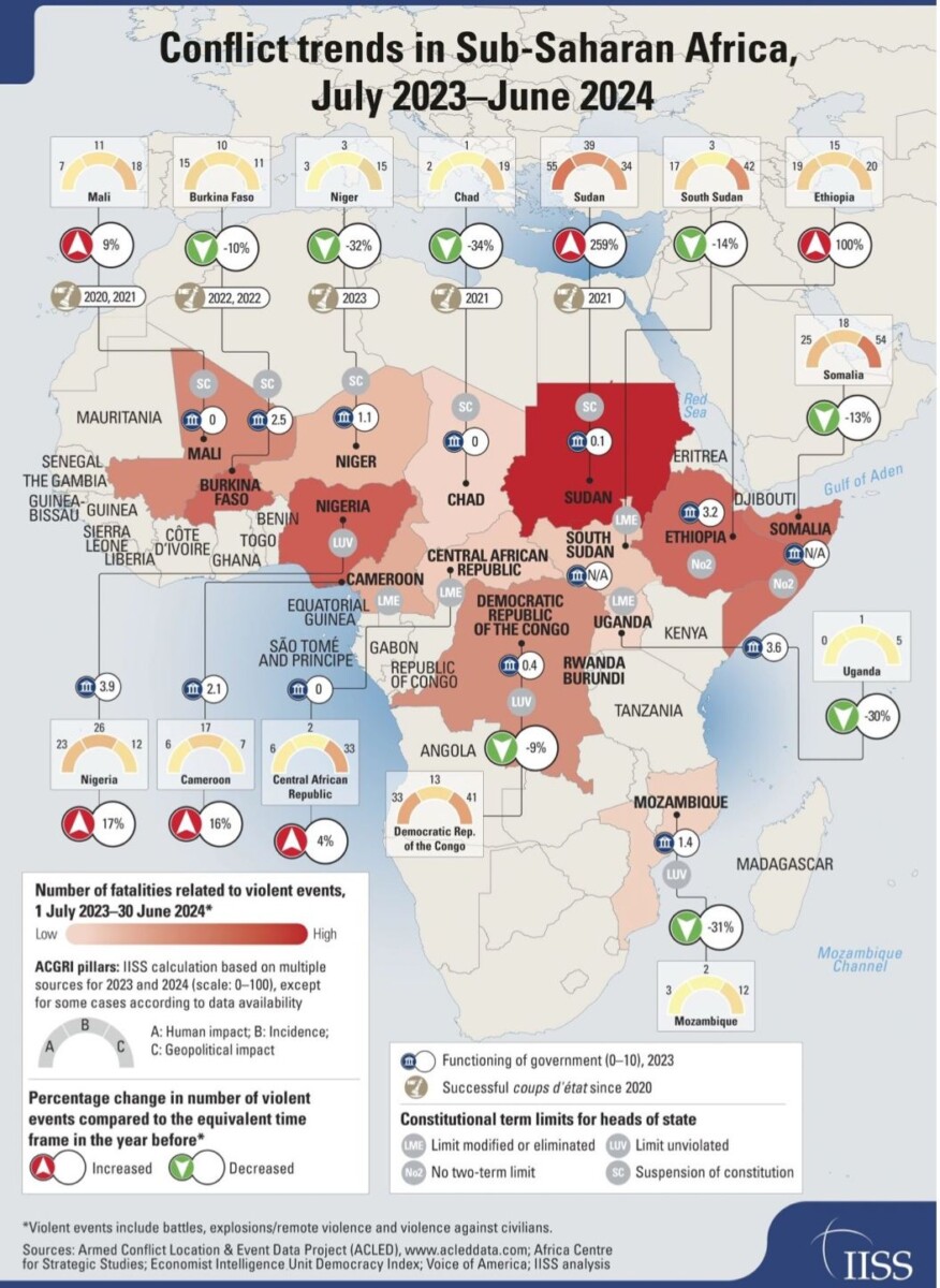 De hashtag #ArmedConflictSurvey2024 toont een stijging van 37% in conflictgerelateerde sterfgevallen, bijna 200.000 tussen juli 2023 en juni 2024, door groeiende complexiteit en geopolitieke spanningen. Midden-Oosten en Noord-Afrika zagen een toename van 315%, voornamelijk in Palestijnse gebieden. Humanitaire noden stegen, maar financiering daalde met 36%, versterkt door wereldwijde crises. Sub-Sahara Afrika is zwaar getroffen, met 14 van de 49 landen in oorlog.