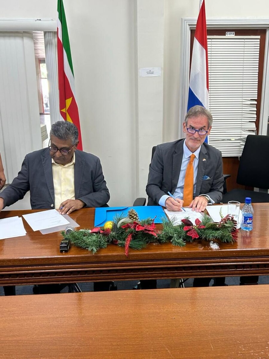 De Nederlandse ambassadeur Walter Oostelbos en minister Stanley Raghoebarsing van Financiën en Planning tekenden maandag 6 januari een contract voor de Nederlandse bijdrage aan het Surinaamse Productie Krediet Fonds.