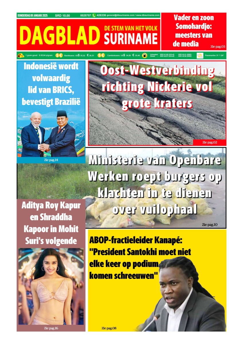 Dagblad Suriname, donderdag 9 januari 2025 Geplaatst op januari 9, 2025januari 9, 2025 Bericht navigatie VorigeKorpschef oriënteert zich persoonlijk bij afdeling Verkeer na klachten burgersVolgendeBraziliaanse non is nu de oudste persoon ter wereld met 116 jaar