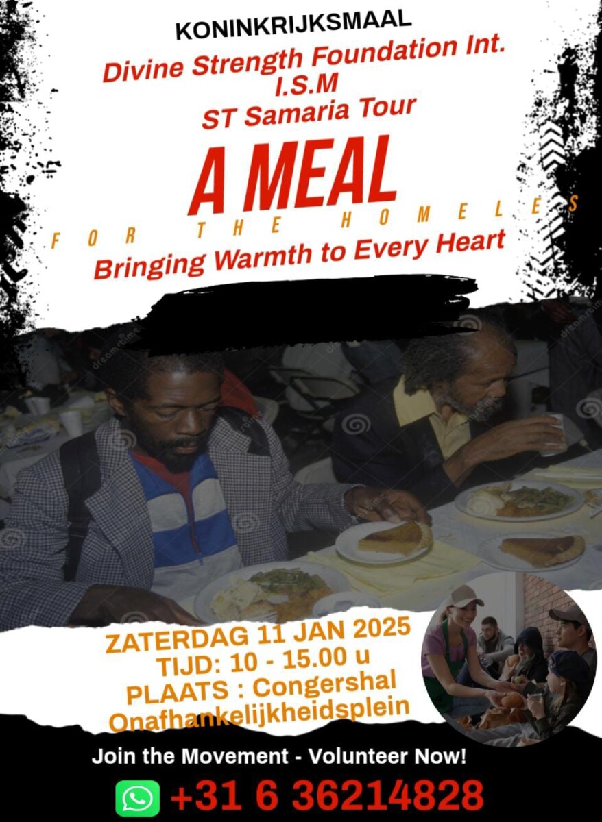 Divine Strength Foundation International onder leiding van voorzitter Astrid Sweeb-Bekmy, Stichting Samaria Tour onder leiding van mevrouw Madjerin Petrusie en stichting de Stem onder leiding van Apostel Lansdorf organiseren vandaag, zaterdag 11 januari, een bijzondere koninklijke maaltijd voor dak- en thuislozen in de congreshal in Paramaribo. Deze activiteit is bedoeld om de doelgroep te ondersteunen en hen een moment van waardigheid en zorg te bieden.