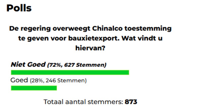 Een recente peiling van Dagblad Suriname onthult een duidelijke publieke mening over de mogelijke toestemming voor bauxietexport door het Chinese mijnbouwbedrijf Chinalco’s.