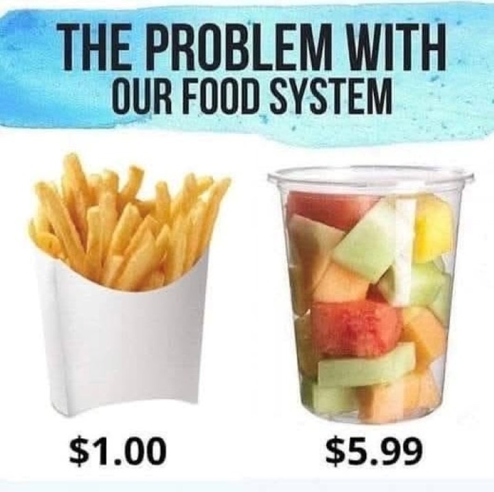 Vers fruit en groenten vereisen vaak zorgvuldige logistiek, seizoensgebondenheid en soms import, wat de prijs opdrijft. Junkfood daarentegen is vaak massaal geproduceerd en bevat ingrediënten die lang houdbaar en goedkoop zijn. Daarnaast zijn er subsidies op gewassen zoals maïs en soja die veelal worden gebruikt in goedkope snacks, wat de kosten verder drukt.