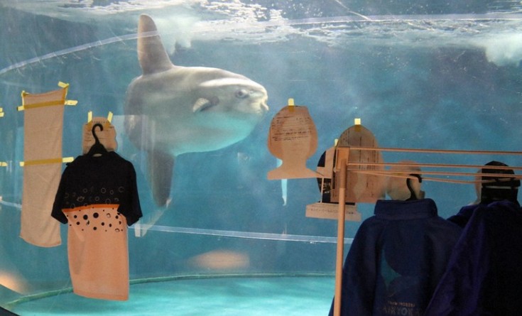 Op beelden zijn figuren van karton bij het aquarium te zien, schrijft de BBC. Ze zijn aan uniformen bevestigd om zo de vis gezelschap te houden.