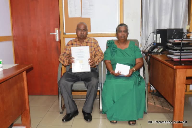 Namens de regering mocht het echtpaar uit handen van regeringsvertegenwoordigers, een ingelijste oorkonde en de gebruikelijke enveloppe met inhoud in ontvangst nemen, zo meldt het Burger Informatie Centrum Paramaribo Zuid-West op Facebook.